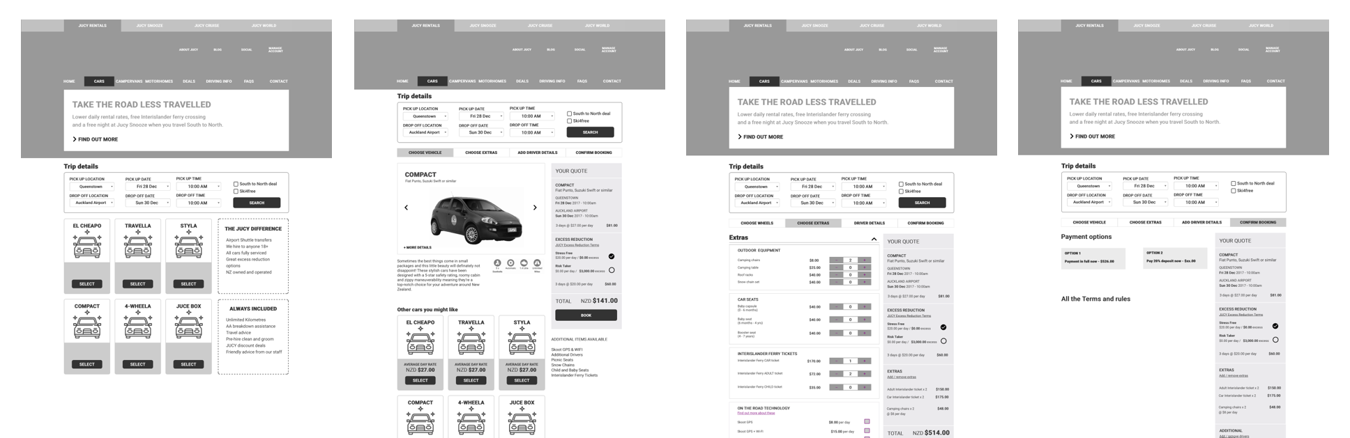 The ‘loud and proud’ Jucy brand featured two very strong colours that made designing a usable UI difficult. The information architecture was confusing and convcersion rates below industry standards. A new UX and design system optimised the brand while still retaining the unique style, and optimised user journeys across all devices.